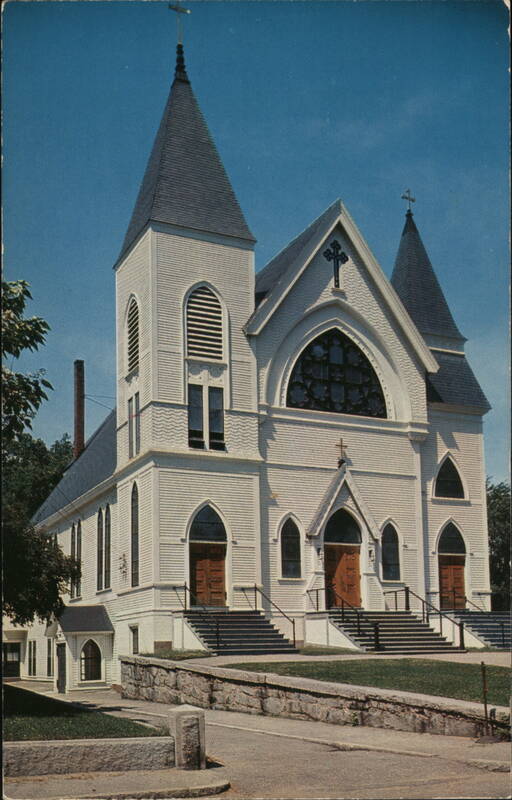 A view of the white, wood-sided St. Patrick's Catholic Church, featuring a main steeple and a smaller turret, arched doorways, and a prominent arched window over the central entrance. A stone retaining wall lines the driveway in the foreground.