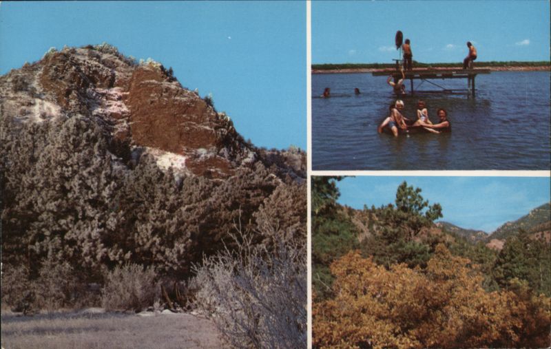 | Home of the May Natural History Museum, featuring a display of 7,000 invertebrates, and the Golden Eagle Ranch Campgrounds, with 500 wooded campsites where the Rockies meet the plains. The card shows scenes from the thousand-acre ranch, including people swimming and landscapes. |