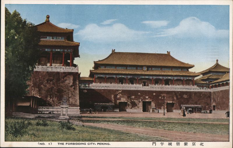 | View of the Meridian Gate (Wumen), the main southern entrance to the Forbidden City in Peking, showing its large central tower and wing structures built atop a massive wall. The Chinese text reads from right to left: 北亰紫禁城午門 (Beijing, Forbidden City, Meridian Gate). |