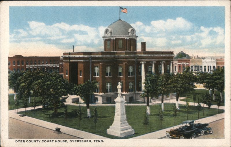 | The Dyer County Court House, a brick building with a central dome and classical columns. A monument with a statue stands on the front lawn. Early 20th-century automobiles are parked on the street, and the Dyersburg Hardware Co. building is visible in the background. |