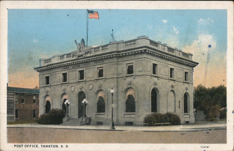 Two-story Beaux-Arts style stone building with arched windows and an eagle sculpture over the main entrance. An American flag is flying from a flagpole on the roof.