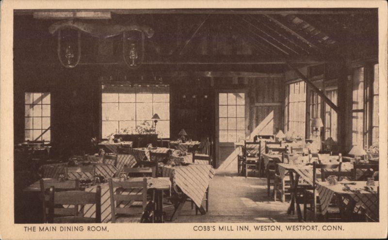 Interior view of a rustic dining room with tables set for service. The back side advertises: "Dine--Drink--Dance--Swim Sleep--by the waterfall at Cobb's Mill Inn--one of the beauty spots of Connecticut."