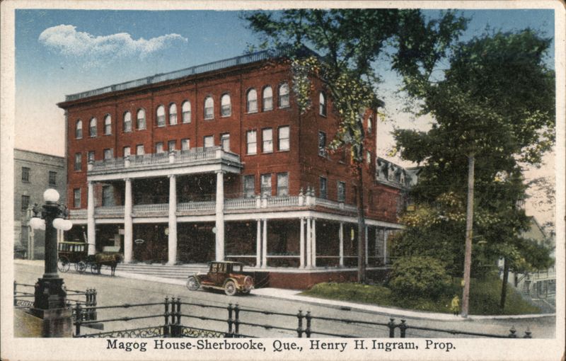 | The four-story red brick hotel features two levels of white verandas supported by columns. Henry H. Ingram is listed as the proprietor. An early automobile is parked on the street and a horse-drawn carriage is visible further down the road. |