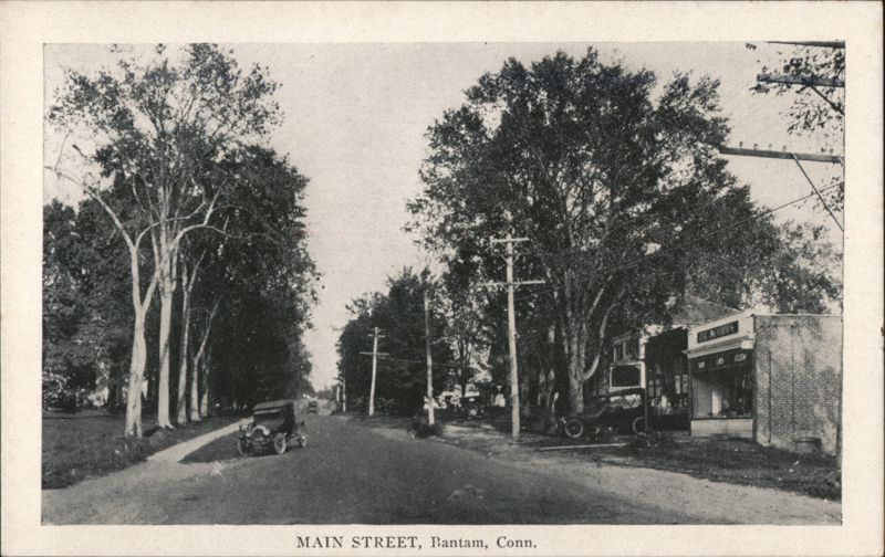 A view of a wide, tree-lined street with early automobiles. On the right are several buildings, including a store with a prominent storefront, and utility poles.