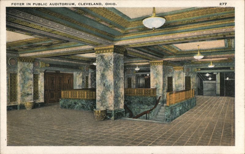 Ornate foyer with marble-clad square columns, green marble balustrades, a tiled floor, and a decorative coffered ceiling with intricate patterns in gold and teal. Pendant lights hang from the ceiling.