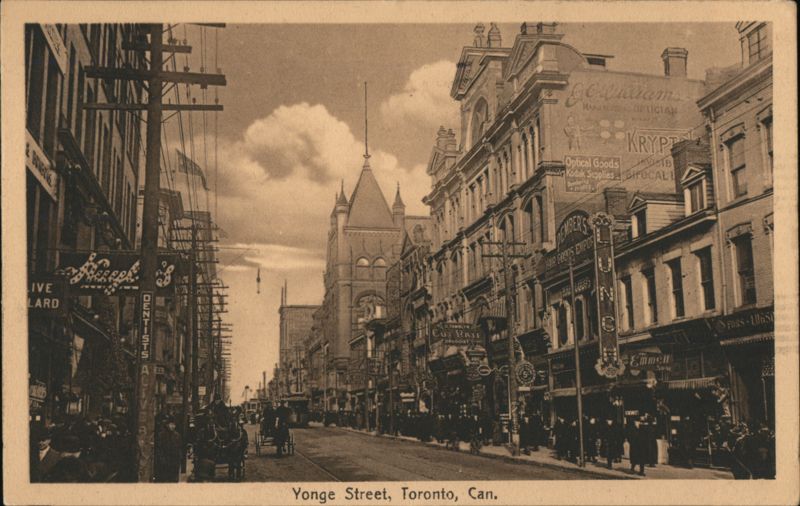 | Street scene of Yonge Street looking north, with early 20th-century buildings, horse-drawn carriages, streetcar tracks, and numerous pedestrians. Signs for businesses such as C.O. Williams Optician, Kryptok lenses, and dentists are visible. |