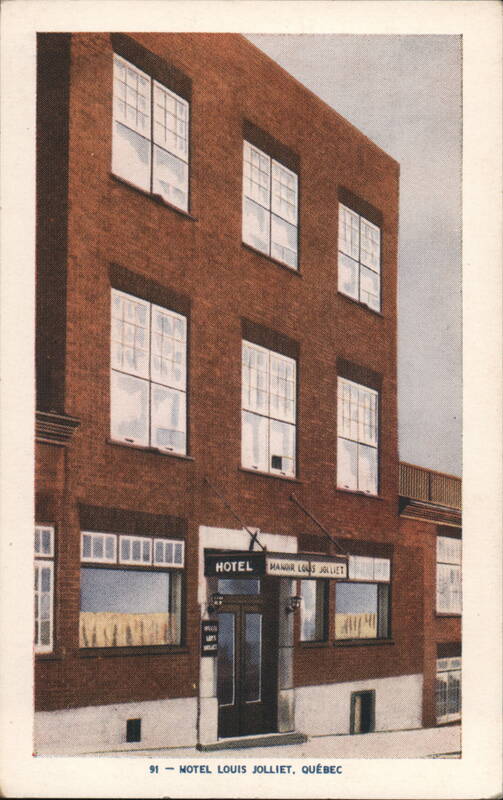 Exterior view of the multi-story, red brick Motel Louis Jolliet. The building features numerous multi-paned windows and an awning over the entrance.