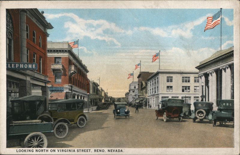 Street view with early 20th-century automobiles parked and driving on Virginia Street. Multi-story brick buildings, one with a 'DRUGS' sign, are visible, and several American flags are flying.