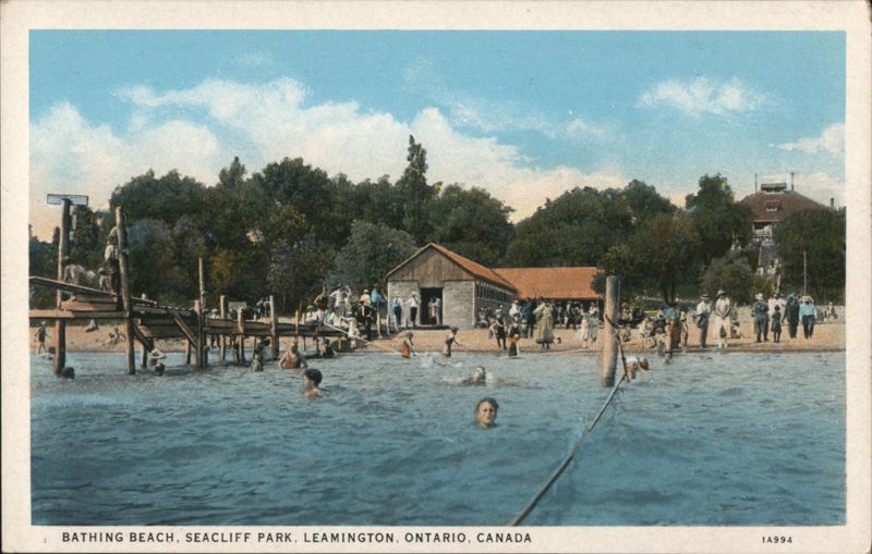 People enjoying a sunny day at the bathing beach in Seacliff Park. Swimmers are in the water, while others are on the beach and a wooden pier. A bathhouse or pavilion is visible on the shore, backed by trees.