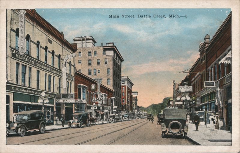 A view looking down a busy street lined with early 20th-century automobiles and featuring trolley tracks. Notable business signs include F.W. Woolworth Co. 5 and 10 Cent Store, Michigan Business & Normal College, Rome & Hamer, and Arcade. |