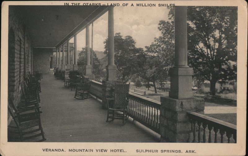 The veranda of the Mountain View Hotel lined with rocking chairs, overlooking the landscape of the Ozarks. The top of the card reads "IN THE OZARKS — LAND OF A MILLION SMILES".