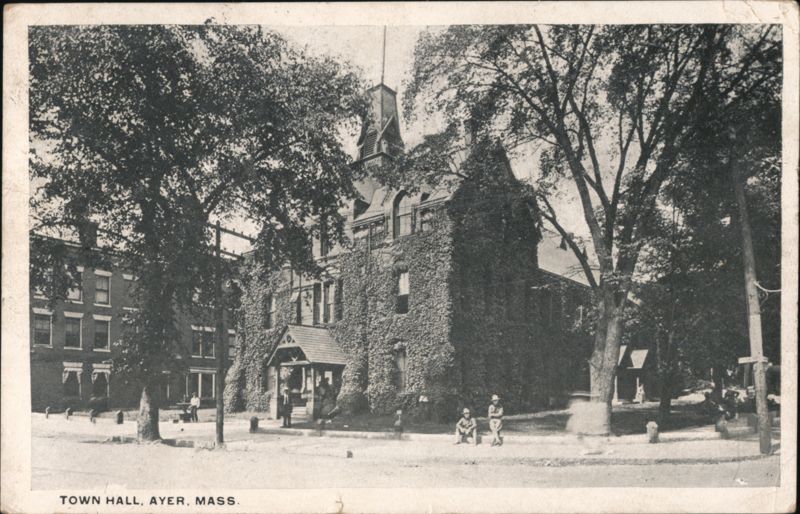 An ivy-covered, three-story municipal building with a prominent cupola. The view is from a street lined with large trees, with several people visible near the building and on the sidewalk.