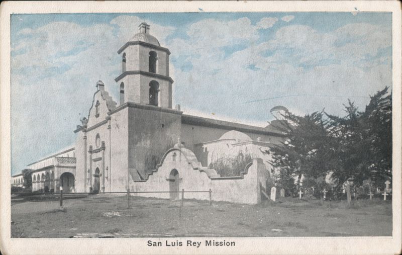 The exterior of the San Luis Rey Mission, a Spanish-style church with a prominent bell tower. To the right is a small cemetery with simple crosses and several trees. A low wall encloses the front of the property.