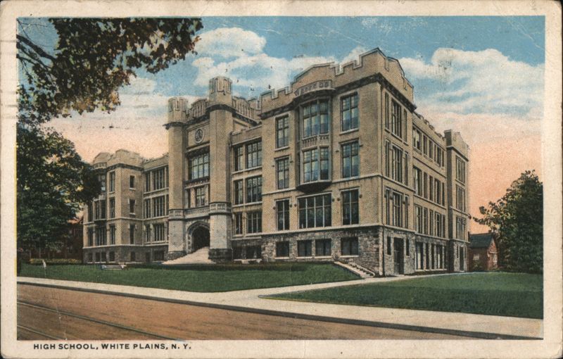 | View of the crenellated high school building, constructed of light-colored brick with a stone foundation. An arched entryway is prominent at the center. Trees frame the scene, and what appear to be trolley tracks run along the road in the foreground. |