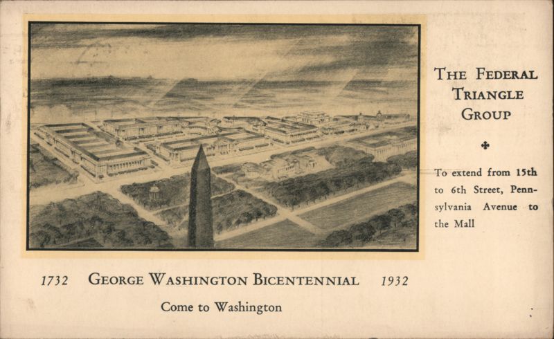 Drawing of the Federal Triangle Group, a complex of buildings to extend from 15th to 6th Street, Pennsylvania Avenue to the Mall. The card commemorates the George Washington Bicentennial, 1732-1932, and includes the invitation "Come to Washington". The reverse features an image of the Woodward & Lothrop department store, described as "A Store Worthy of the Nation's Capital". |