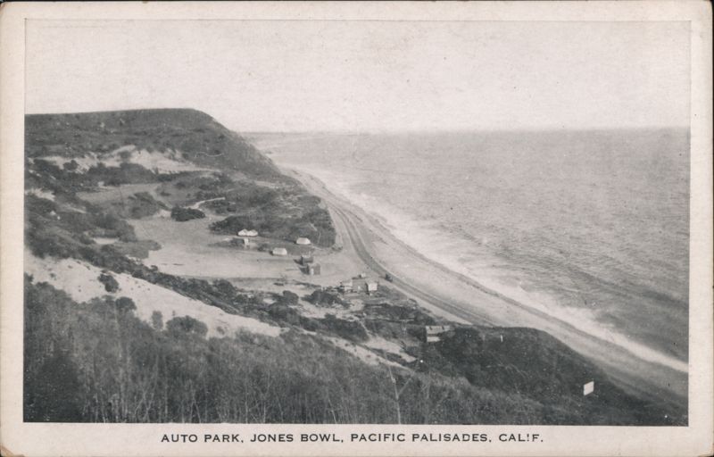An elevated view of the coastline at Jones Bowl, showing a beach, the Pacific Ocean, railroad tracks, and an auto park at the base of the cliffs.