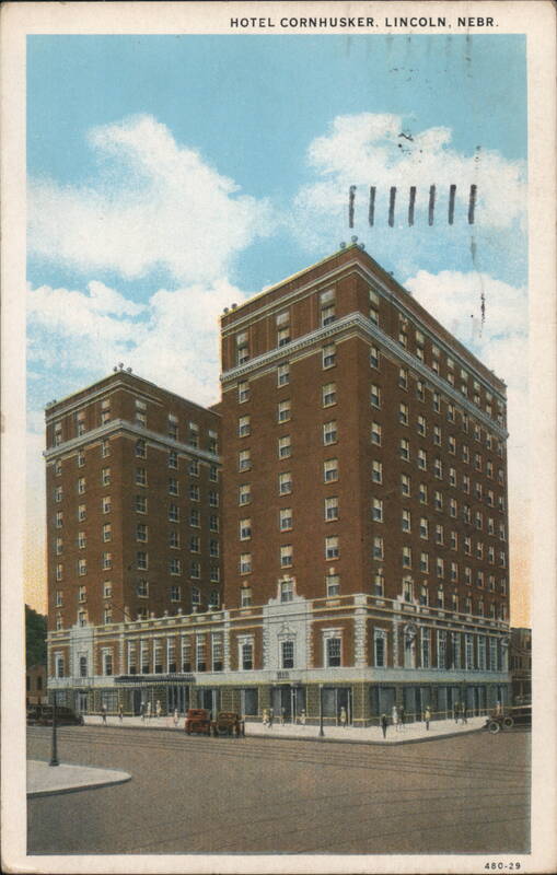 A view of the large, multi-story brick Hotel Cornhusker at a street corner. The building features an ornate two-story white base. Early 20th-century cars are parked and driving on the streets below a partly cloudy sky.