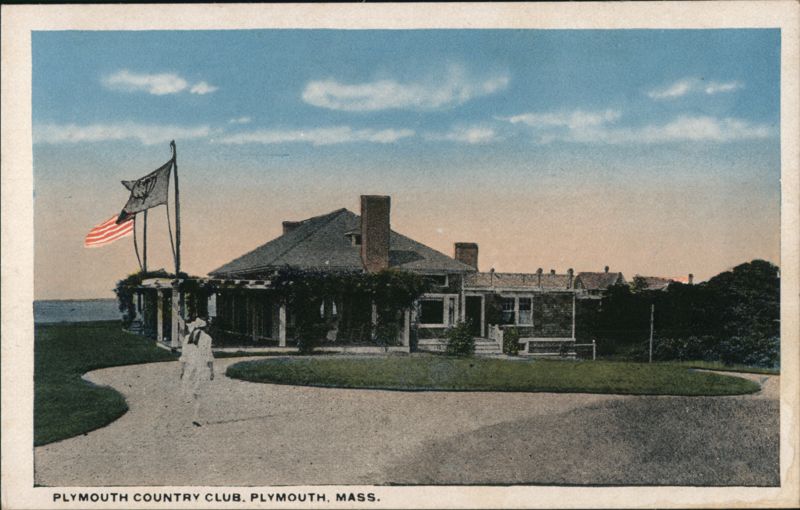 A view of the Plymouth Country Club building, with a person in a white outfit walking on a curved driveway in front. A flagpole flies a yacht ensign style flag. The ocean is visible in the background to the left.