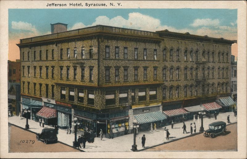 Street corner view of the multi-story brick Jefferson Hotel. The building features shops with awnings on the ground level. Vintage automobiles and pedestrians are visible on the streets.