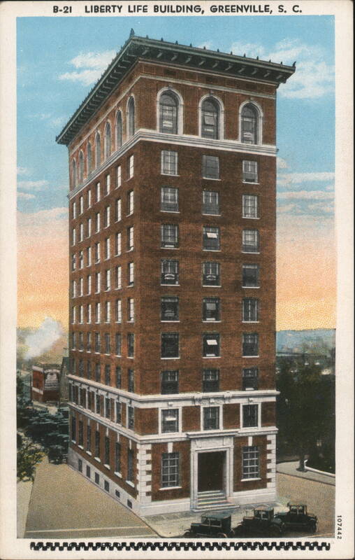 A multi-story brick building with arched windows on the top floor and decorative cornice. Early 20th-century automobiles are parked on the street in front.