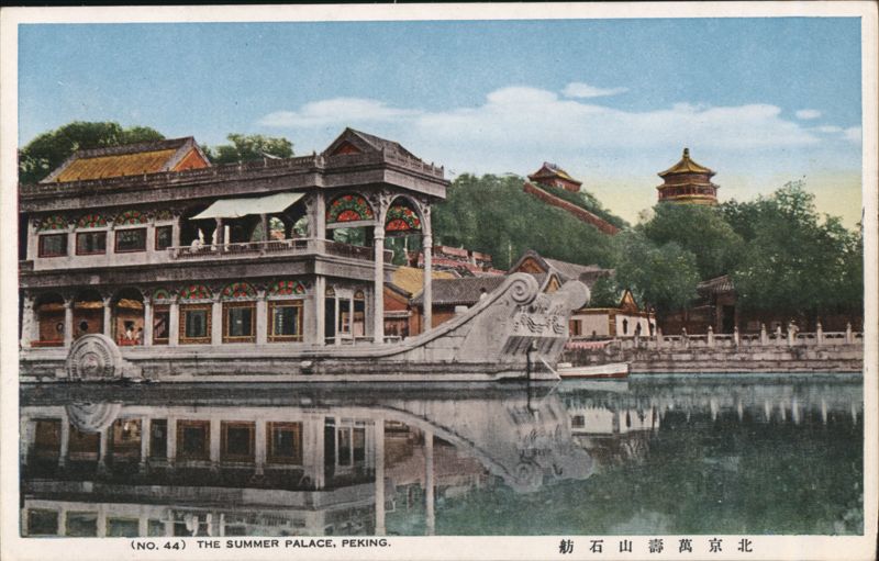 The view shows the ornate, two-story Marble Boat (Shi Fang) on Kunming Lake at the Summer Palace. In the background is Longevity Hill with a pagoda on its peak.