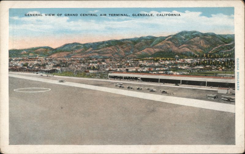 View of the Grand Central Air Terminal showing several airplanes on the tarmac in front of hangars, with the city of Glendale and mountains in the background.