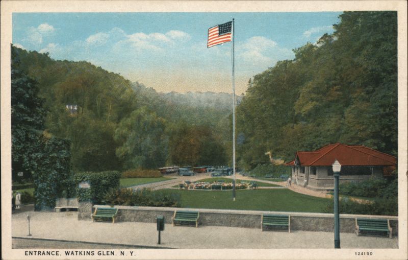 An American flag flies over the entrance to a park. A small building with a red roof is visible on the right, with cars parked nearby. The area is surrounded by lush, wooded hills. Benches line a stone wall in the foreground.