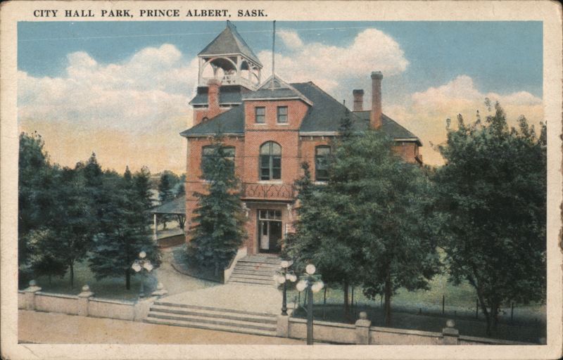 A handwritten message on the back indicates that the building's front windows are part of the Library, while the Council Chamber is at the back. It also identifies a bandstand in the park. The message is signed by A. Heyworth, Librarian.