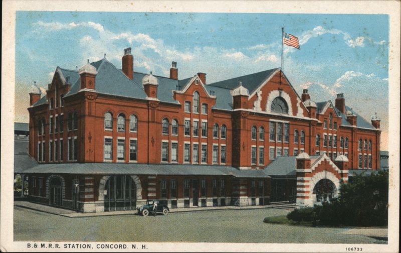 A large, multi-story red brick railroad station in a grand architectural style, featuring multiple towers, gables, and a prominent arched entryway. A vintage automobile is parked in the foreground, and an American flag flies from a flagpole on the roof. |