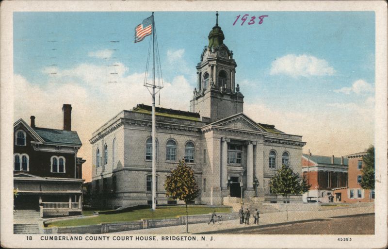 View of the Cumberland County Court House, a neoclassical building with a clock tower. An American flag flies from a tall flagpole on the front lawn. A house is visible to the left, and a few people are on the sidewalk in front of the building.