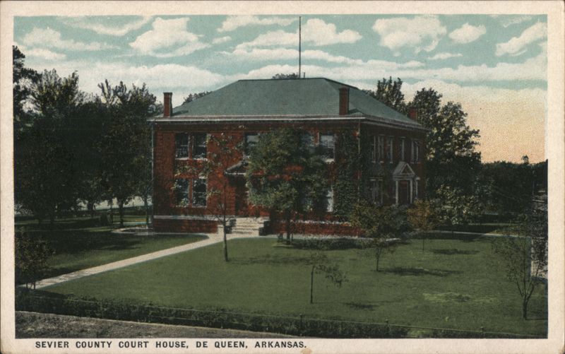 Exterior view of the Sevier County Court House, a two-story brick building with a hip roof. The courthouse is surrounded by a manicured lawn, trees, and a walkway leading to the entrance.