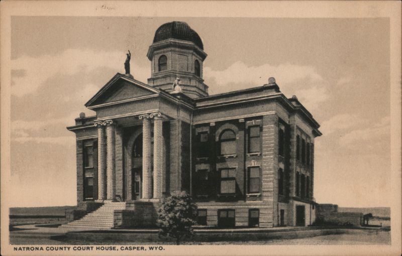 Exterior view of the neoclassical-style Natrona County Court House, featuring a prominent portico with four large columns, a pediment topped with a statue, and a central dome.