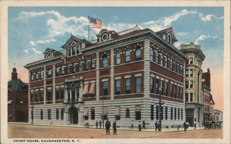 A corner view of the large, red brick Court House with white stone quoins and trim. The building features arched windows, awnings, and an American flag flying from the roof. People and a bicycle can be seen on the street below.