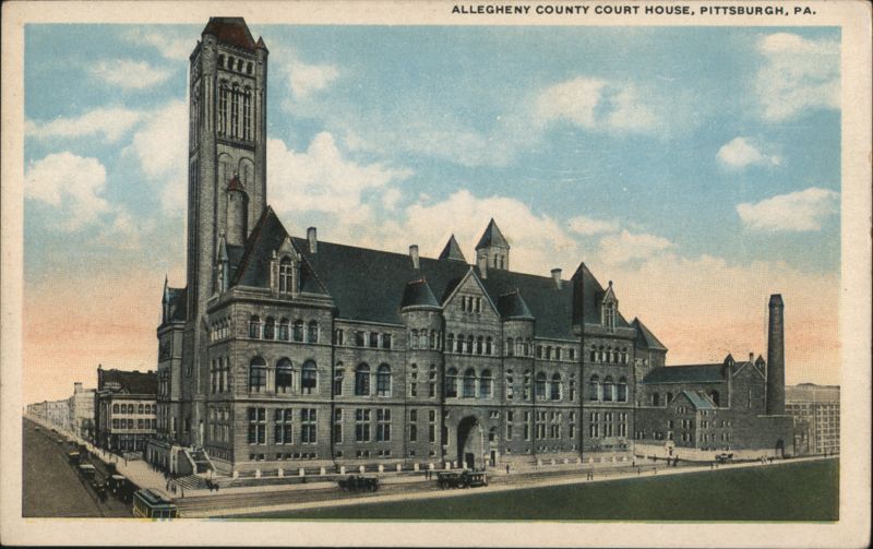 Situated on Grant's Hill is one of the city's largest buildings. It covers an entire block and the recent cutting of the hump has made it still more imposing. Stone steps have been erected to conform with the new street level, which has been lowered 21 feet at that point. The building, of stone construction, was completed April 17, 1888 at a cost of $2,341,456.06. The interior furnishings cost $113,107.61. The height of the building is some 600 feet and a tower extends 330 feet above the roof level. PITTSBURGH PROMOTES PROGRESS. |