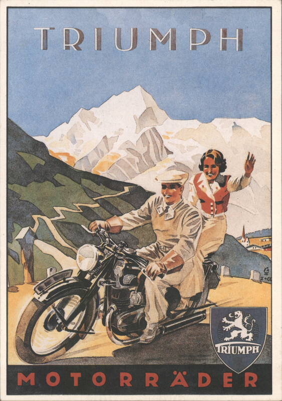 An advertisement illustration showing a man and a woman riding a classic Triumph motorcycle on a winding road through a snowy mountain range. The woman on the passenger seat is waving. A Triumph logo shield is in the bottom right corner.