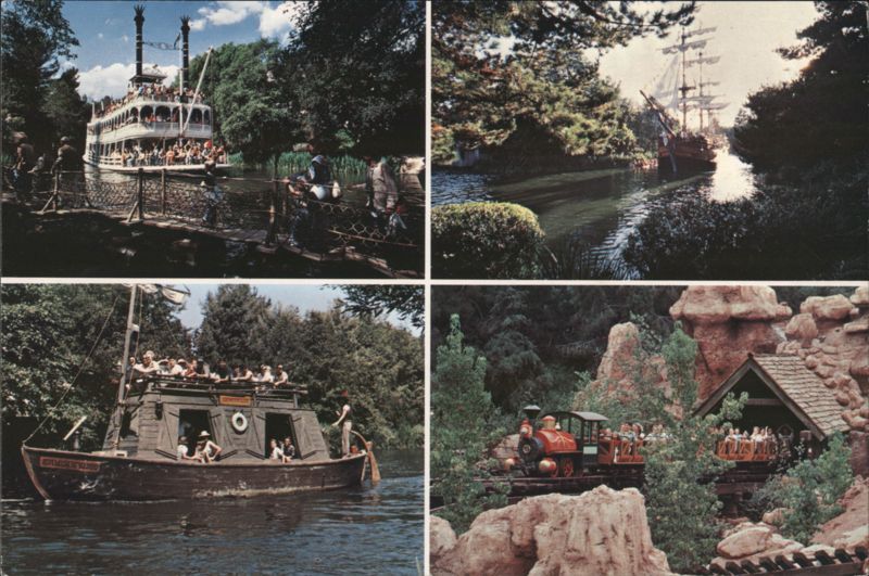Tranquil waters of the Rivers of America contrast with the runaway adventure of Big Thunder Mountain Railroad. Scenes include the Mark Twain Riverboat, the Sailing Ship Columbia, a jungle exploration boat, and a mine train coaster.