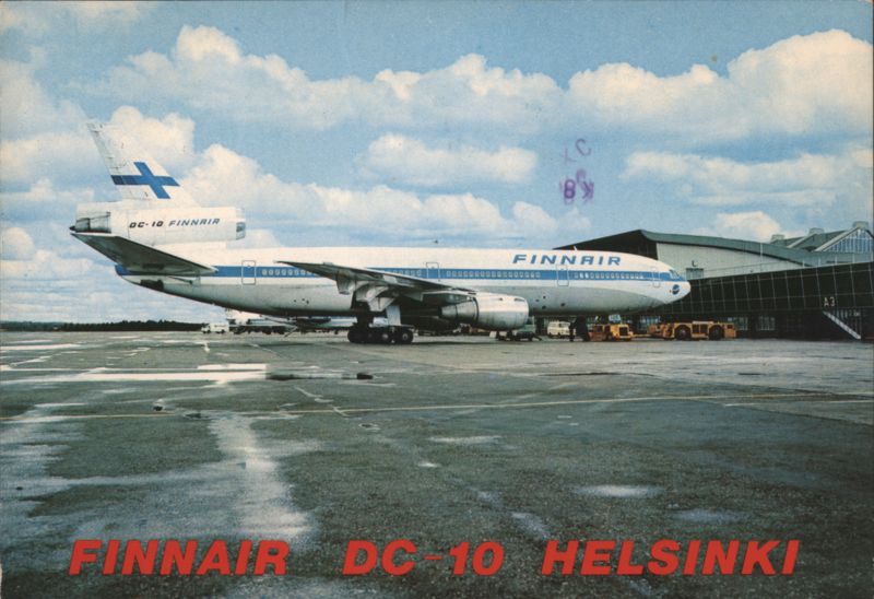 A Finnair McDonnell Douglas DC-10 airplane is parked on a wet tarmac at gate A3 of an airport. Airport terminal buildings are visible in the background under a partly cloudy sky.