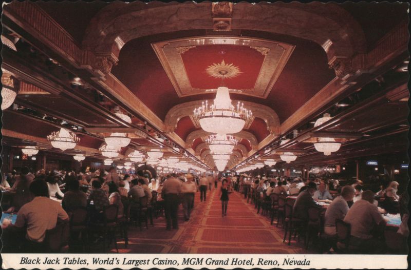 Interior view of the casino floor at the MGM Grand Hotel, billed as the "World's Largest Casino". The hotel featured over 1000 rooms, a 33-acre lake, a Jai Alai Fronton, seven restaurants, and two movie theatres.