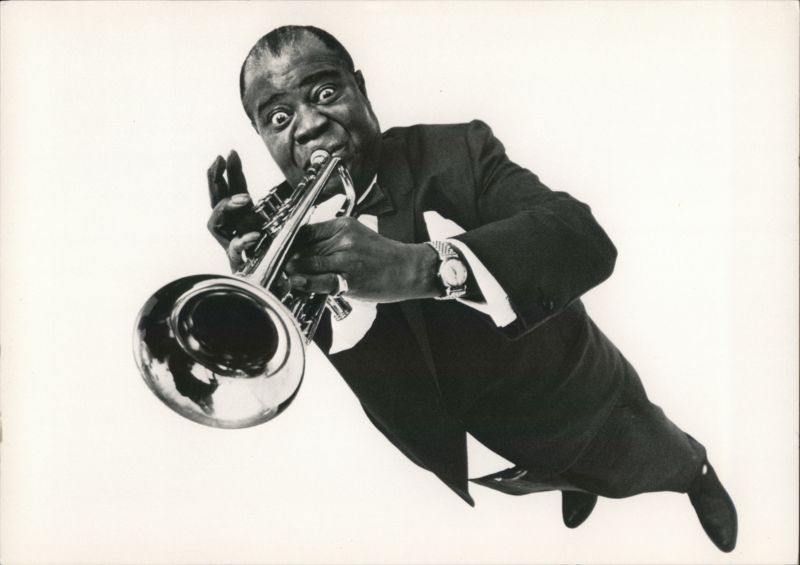 A dynamic black and white portrait of the acclaimed jazz musician Louis Armstrong energetically playing his trumpet.