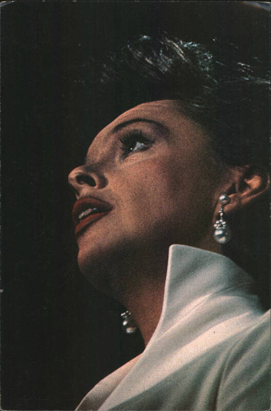 Profile portrait of actress and singer Judy Garland looking upwards against a dark background. She wears prominent pearl drop earrings and a white high-collared blouse.