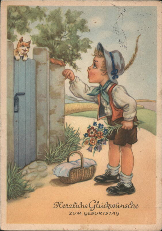 Birthday Greeting, Boy in Lederhosen with Kitten and Flowers