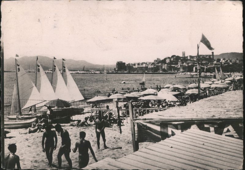 A bustling beach scene with people relaxing under umbrellas and sailboats in the water. In the background is the old quarter of Le Suquet.