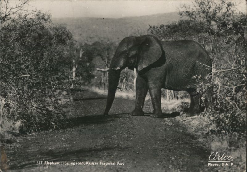 An African elephant stands in the middle of a dirt road, flanked by dense bush and trees.