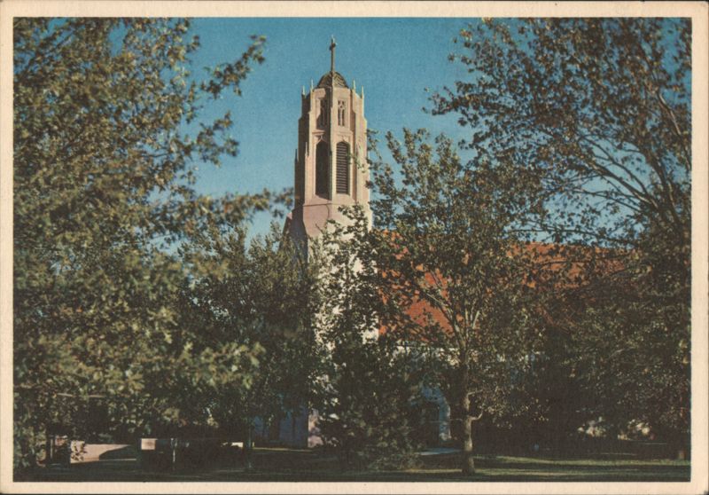 View of the stone bell tower of the Dowd Memorial Chapel, framed by lush green trees against a clear blue sky. A portion of the building's reddish-brown roof is also visible.