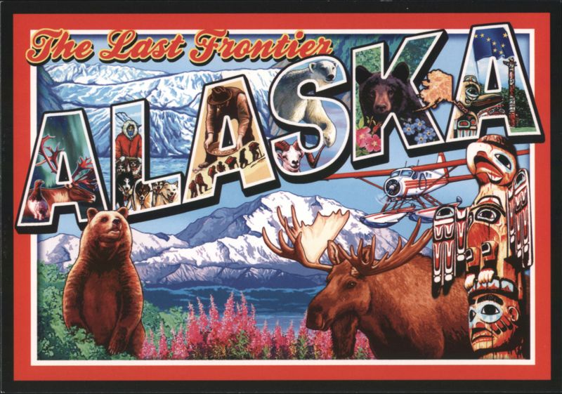 Large letter postcard featuring iconic Alaskan scenes. Images include a grizzly bear, moose, polar bear, gold panning, an indigenous person with sled dogs, totem poles, a floatplane, and a mountain range backdrop.