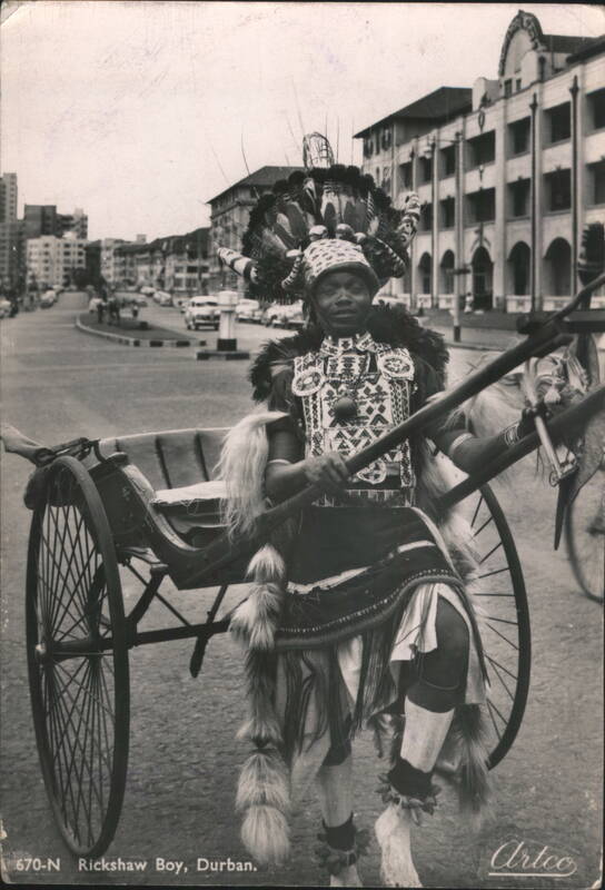 Man in elaborate traditional attire with a feathered headdress, beaded chest piece, and fur accents, posing in a two-wheeled rickshaw on a city street.
