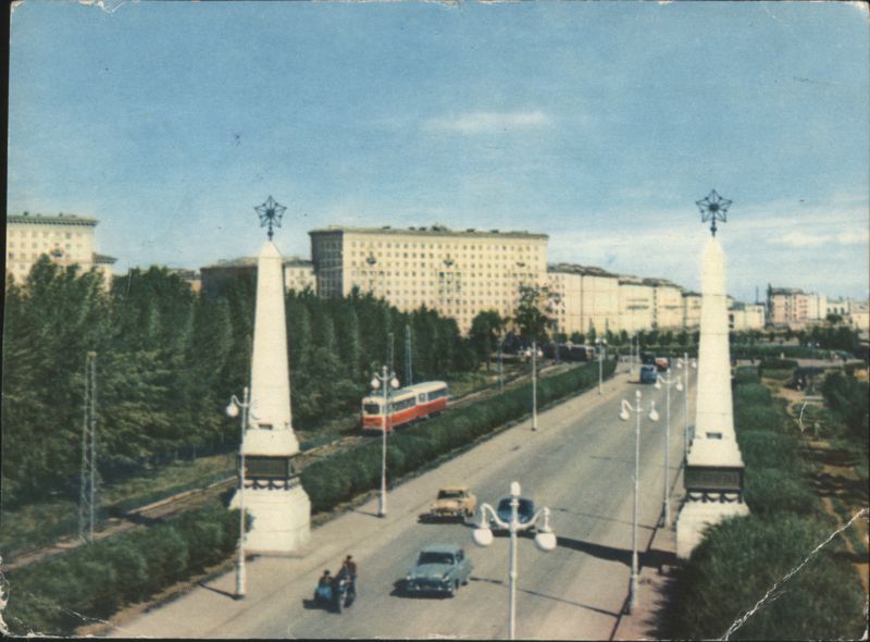 A wide boulevard leading into the city, flanked by two prominent white obelisks decorated with red stars. A red and white tram runs on tracks beside the road, and several mid-century cars are visible. Large Soviet-era apartment buildings are in the background. |