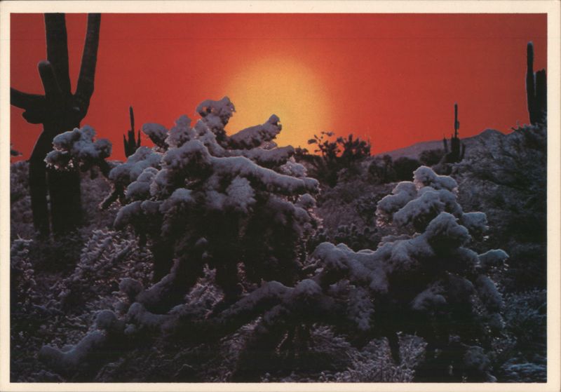 Saguaro Cacti are silhouetted through a blanket of snow against the red sky on the desert.