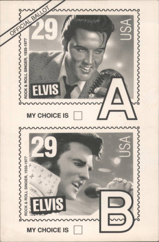 | An official ballot postcard created by the U.S. Postal Service in 1992 for the public to vote on the design of a new commemorative postage stamp featuring Elvis Presley. The front of the card displays two stamp design options: 'A' shows a younger Elvis, and 'B' depicts an older Elvis during his concert era. Voters could check a box for their choice. The reverse side is a pre-addressed postcard to the "Elvis Poll" in Memphis, TN, with fields for the sender's name and address to receive more information about the stamp in 1993. |