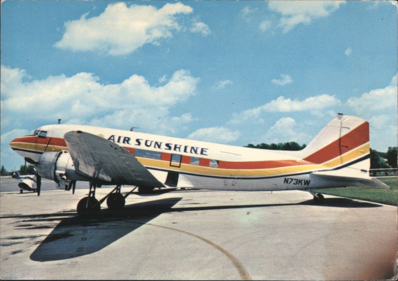 An Air Sunshine Douglas DC-3 airplane with tail number N73KW on an airport tarmac. The plane has a white fuselage with a yellow and orange stripe running along its length and up the tail.